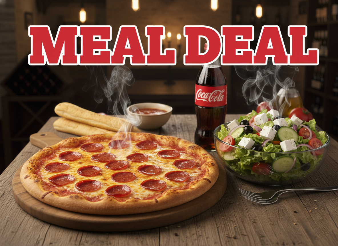 1 16″ Large 1 Topping Pizza, 1 Large Greek Salad and a 2 Liter